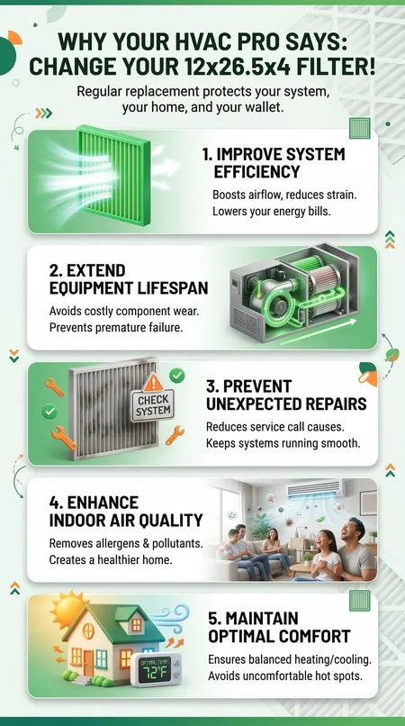 Changing your 12x26.5x4 air filter on a regular schedule is one of the simplest, highest-leverage maintenance decisions a homeowner can make. It protects equipment that costs thousands to repair or replace, keeps energy consumption in check, and directly affects the air quality inside a sealed home where your family spends most of their time.